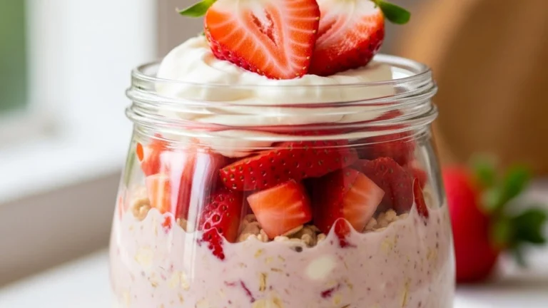 Strawberry cheesecake overnight oats combine oats, Greek yogurt, light cream cheese, and fresh strawberries for a creamy, no‑cook breakfast that tastes like dessert. Perfect for healthy meal prep and busy mornings.