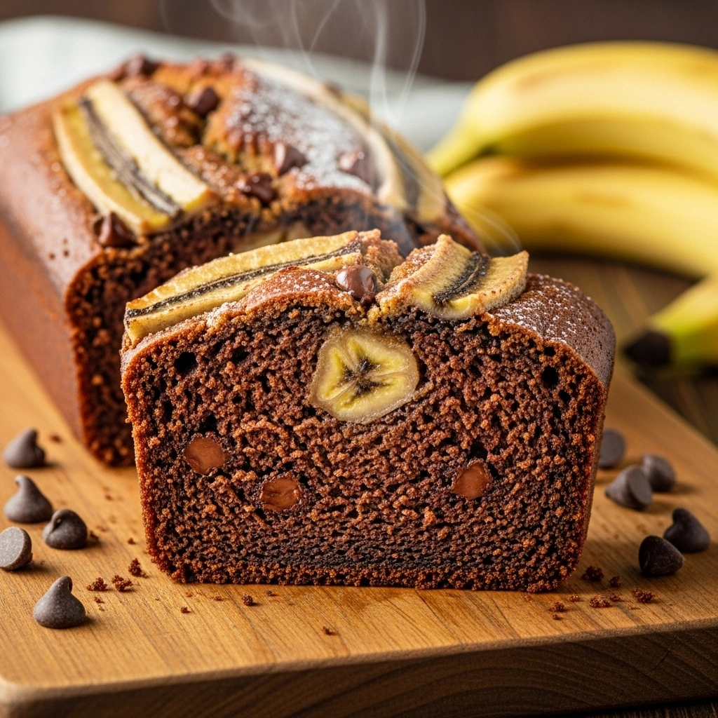 A rich and fudgy chocolate banana bread made with ripe bananas, cocoa powder, and plenty of chocolate chips. This easy one-bowl recipe bakes into a super moist loaf that’s perfect for breakfast, snacks, or dessert.