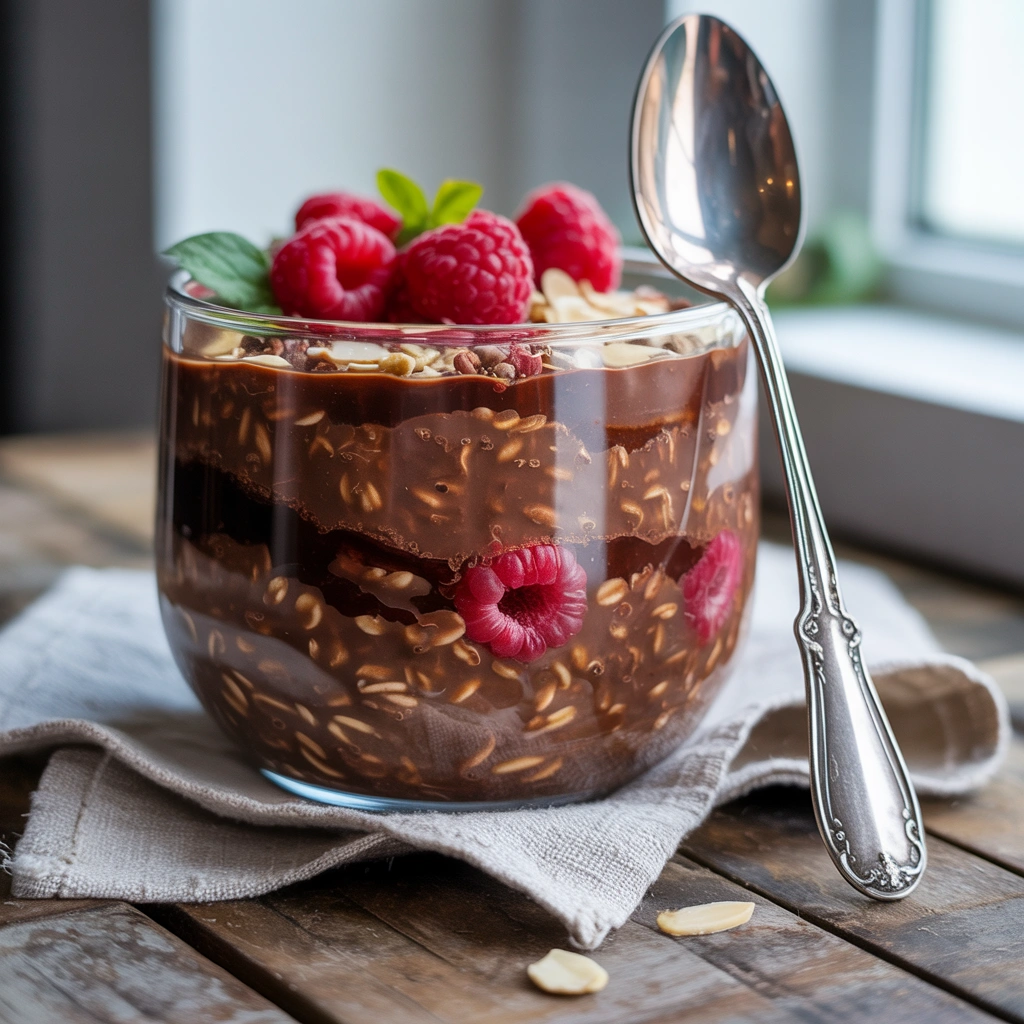 - In the morning, stir, add a splash of milk if too thick, and top with fruit or extra chocolate if desired.
