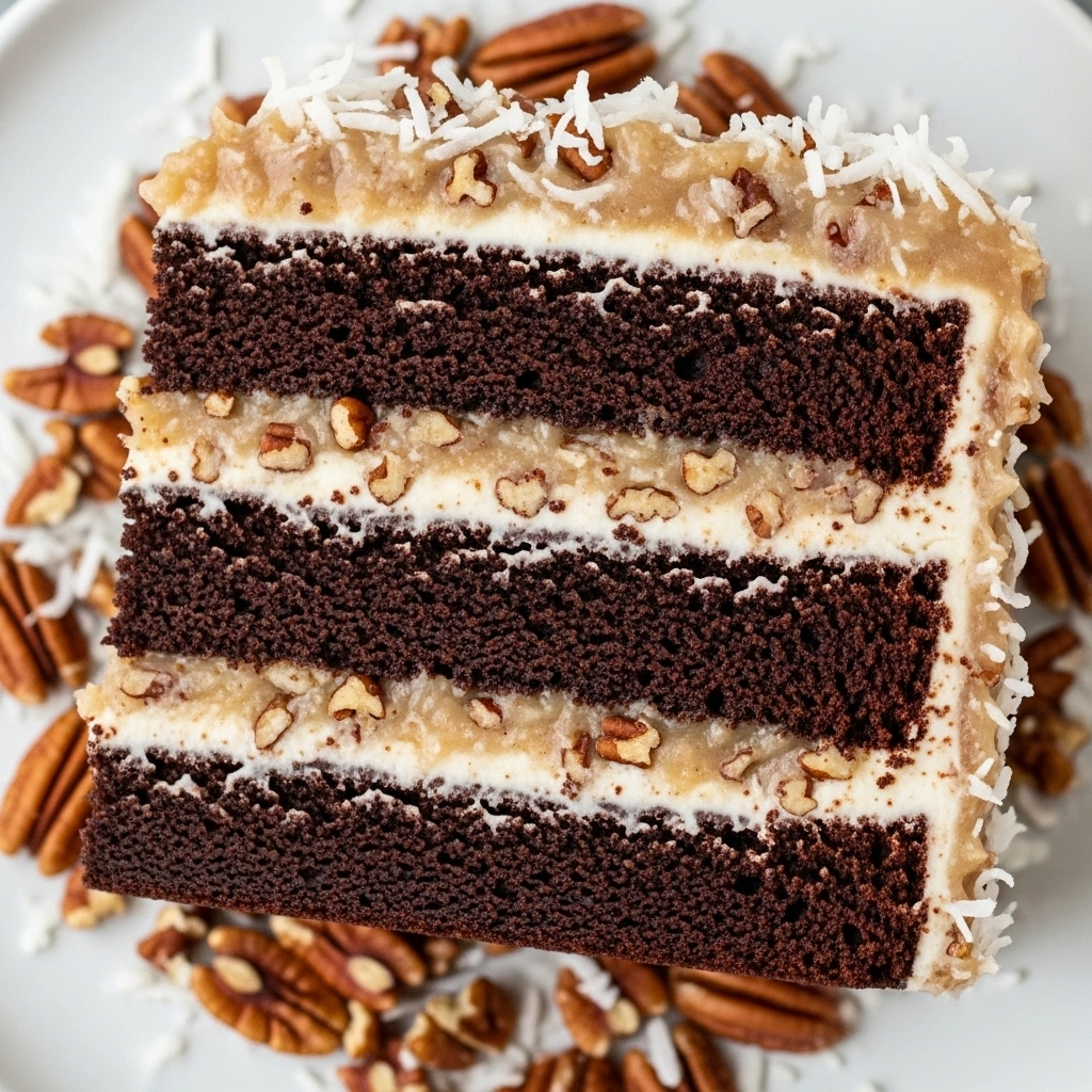 Moist German chocolate cake recipe with tender chocolate layers and a rich, homemade coconut-pecan frosting. Classic American cake perfect for birthdays, holidays, and special occasions.