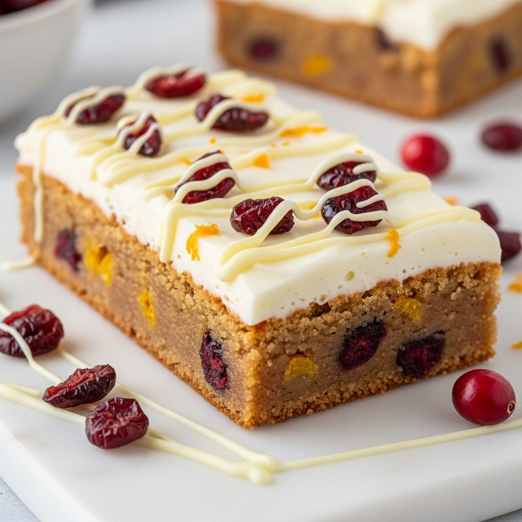 Soft, chewy cranberry bliss bars loaded with white chocolate and dried cranberries, topped with orange-kissed cream cheese frosting, more cranberries, and a white chocolate drizzle. A festive Starbucks-style treat that’s perfect for Christmas and holiday baking.