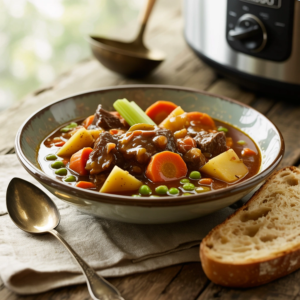 A classic, hearty crockpot beef stew made with tender chunks of beef, potatoes, carrots, and celery in a rich, savory broth. This easy slow cooker beef stew is perfect for cold nights, busy weeknights, and make-ahead meals.
