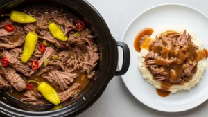 Ultra-tender Mississippi pot roast made in the crockpot with chuck roast, ranch seasoning, au jus mix, pepperoncini, and butter. A “dump and go” slow cooker recipe that creates its own rich, tangy gravy—perfect over mashed potatoes, rice, or noodles.