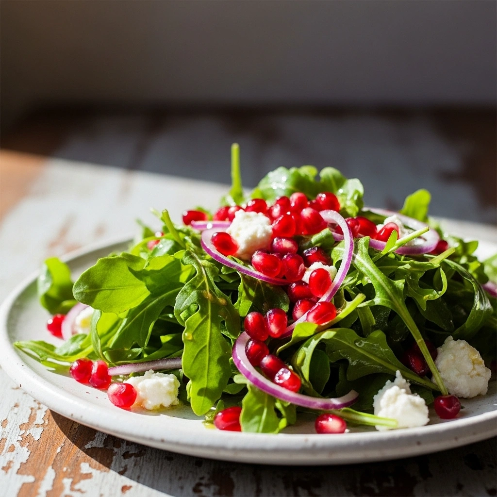 1. Arugula & Pomegranate Salad – Peppery arugula with tart pomegranate seeds and candied pecans