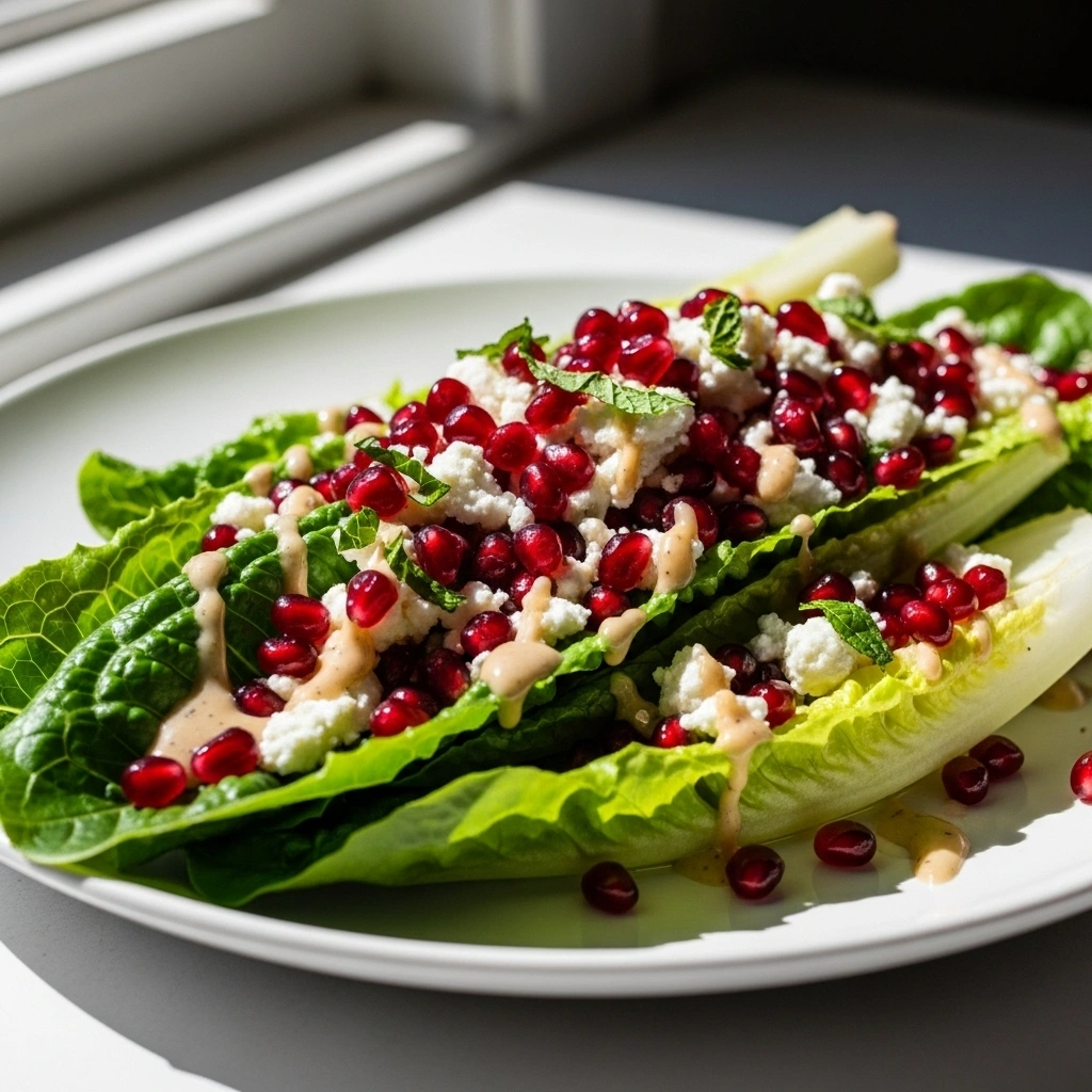 11. Romaine & Pomegranate Salad – Crispy romaine with pomegranate, pistachios, and feta