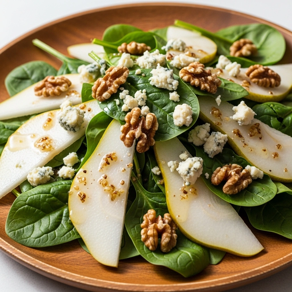 9. Spinach & Pear Salad – Fresh spinach with sliced pears, candied walnuts, and blue cheese