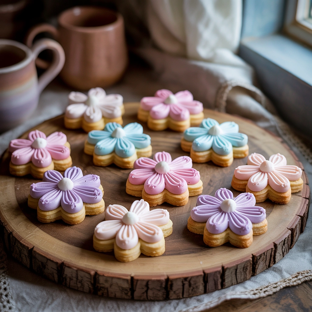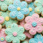 Soft vanilla flower cookies cut into pretty blossom shapes and decorated with pastel icing. Perfect for spring parties, Easter, showers, and tea‑time desserts.