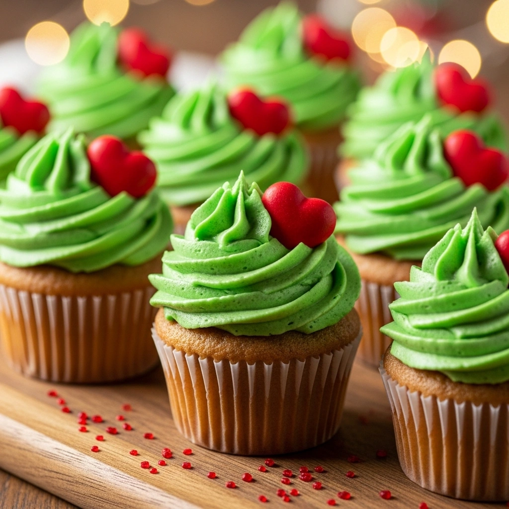 We’ll bake a moist vanilla cupcake base, swirl it with Grinch-green frosting, and finish with a single red heart candy or sprinkle to capture that iconic “heart grew three sizes” look.