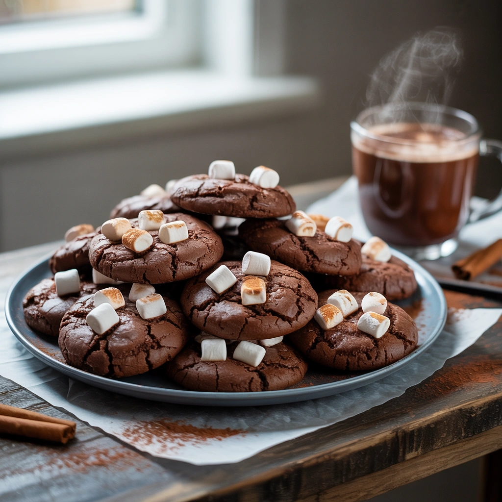 Rich, soft hot cocoa cookies made with chocolate cookie dough, chocolate chips, and gooey toasted marshmallows. These hot chocolate–inspired cookies are perfect for Christmas, snow days, and cozy winter nights.
