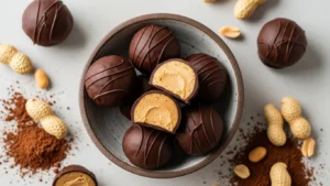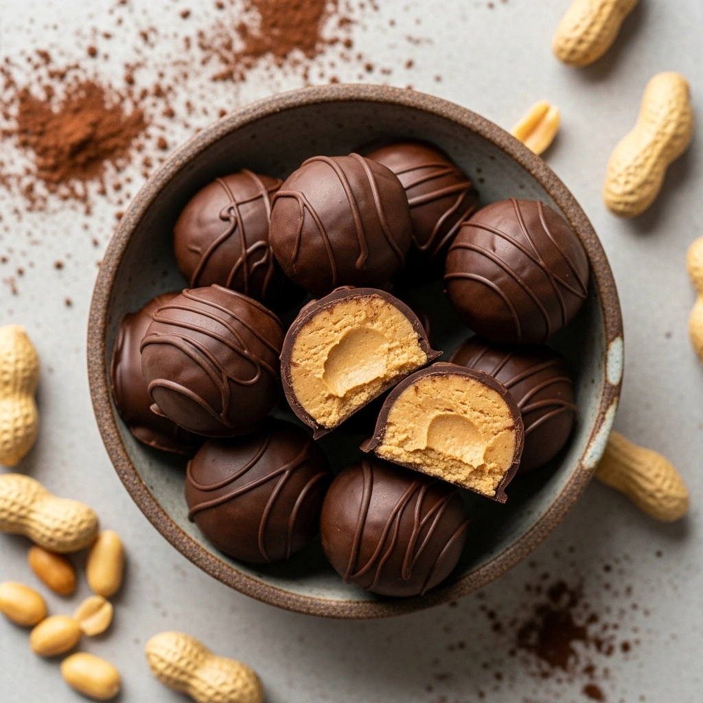 You’ll melt peanut butter with butter or coconut oil, stir in cocoa and keto sweetener, then chill in small molds or roll into balls. Easy, rich, and delicious.