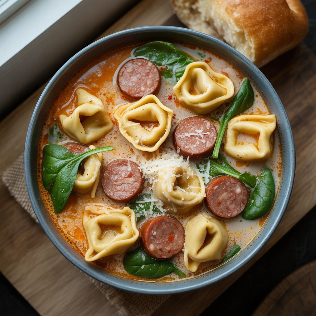 A rich, comforting tortellini soup made with Italian sausage, cheese tortellini, spinach, and a creamy tomato-Parmesan broth. This one-pot recipe is ready in about 30 minutes and tastes like a cozy Italian pasta dish in soup form.