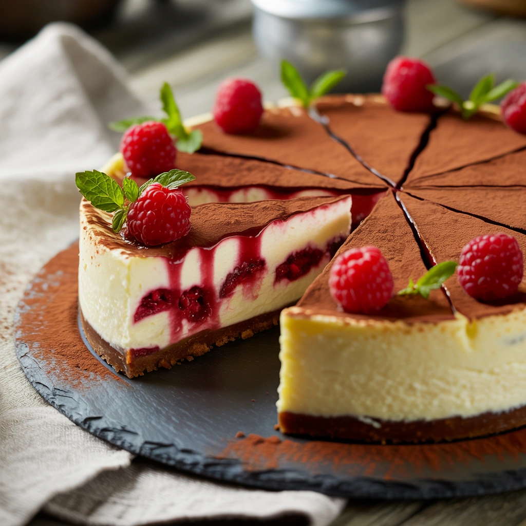 This version keeps the classic baked cheesecake method but folds in raspberry swirls for both visual drama and flavor contrast.